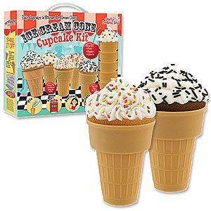 Silicone mold kit bakes up ice cream cone shaped cupcakes that you frost and decorate. Includes six 3 inch x 2.5 inch silicone forms, cupcake mix, vanilla frosting mix, a variety of colored sprinkles, and instructions.